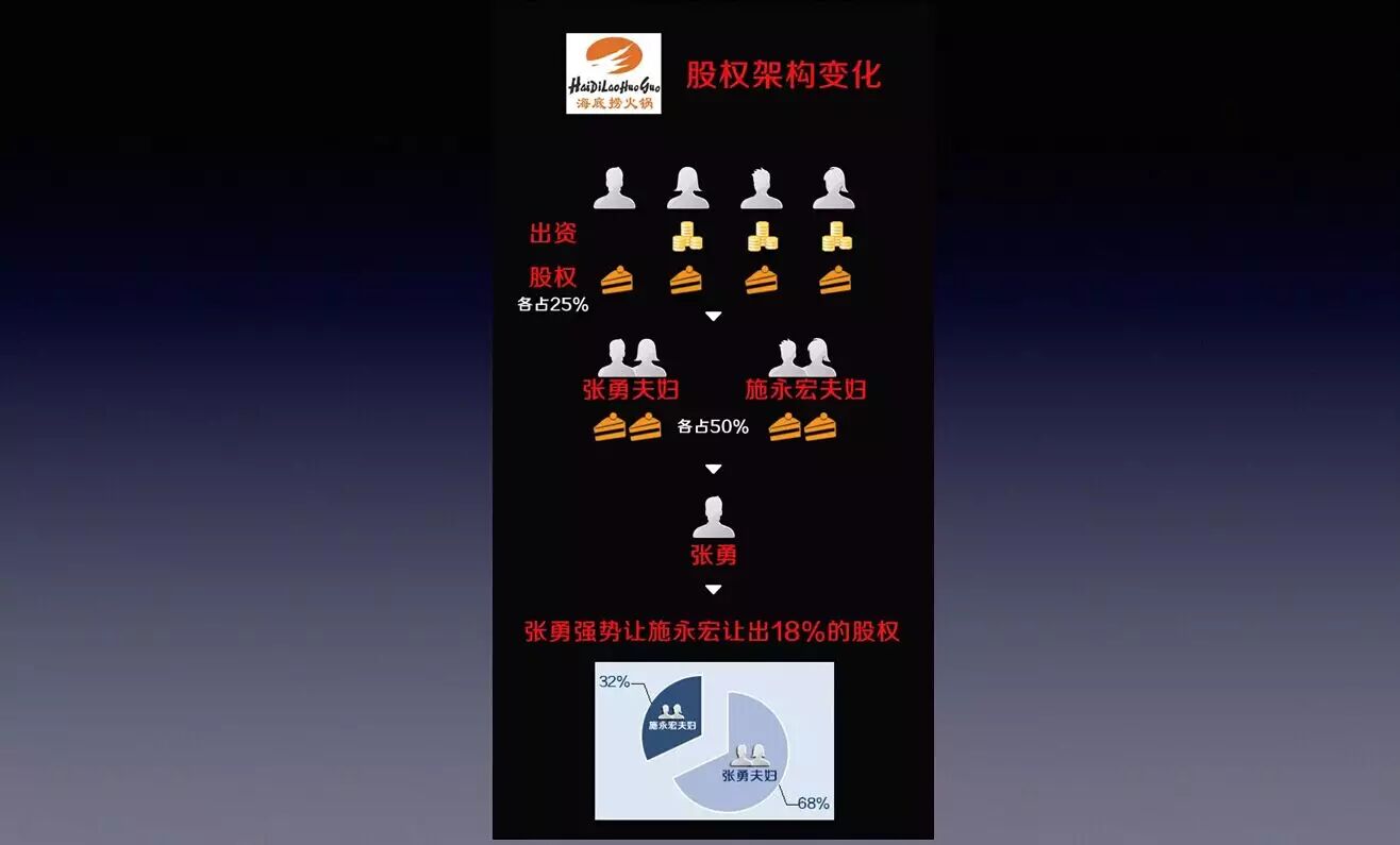 去年,真功夫的纠纷教训可能是最惨烈的,也被大家遗忘了。这个案例,对于在移动互联网创业的我们影响是很大的。大概情况是潘宇海是小舅子,蔡达标是姐夫,原来股权架构是各占50%。为什么出现纠纷?为什么蔡达标让潘宇海出局?