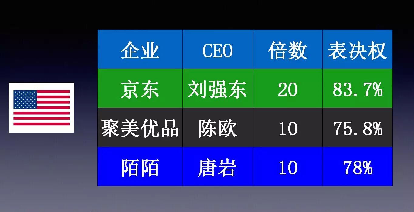 在美国,则可以同股不同权,比如,京东在美国IPO,也是做AB股,持股比例放大20倍,其他几家都是放大10倍。在美国是允许的AB股这种制度,这三家经AB股的安排,控股权达到70%以上。