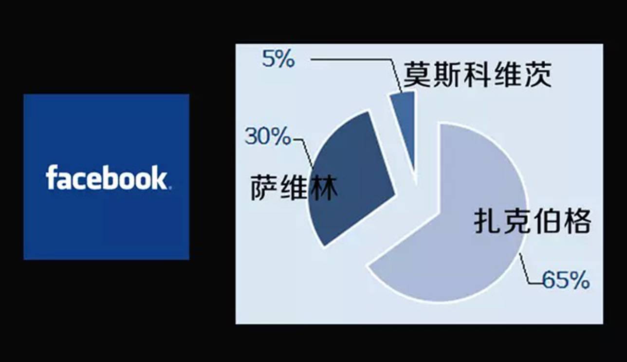 3、Facebook:扎克伯格65%、萨维林30%、莫斯科维茨5%。