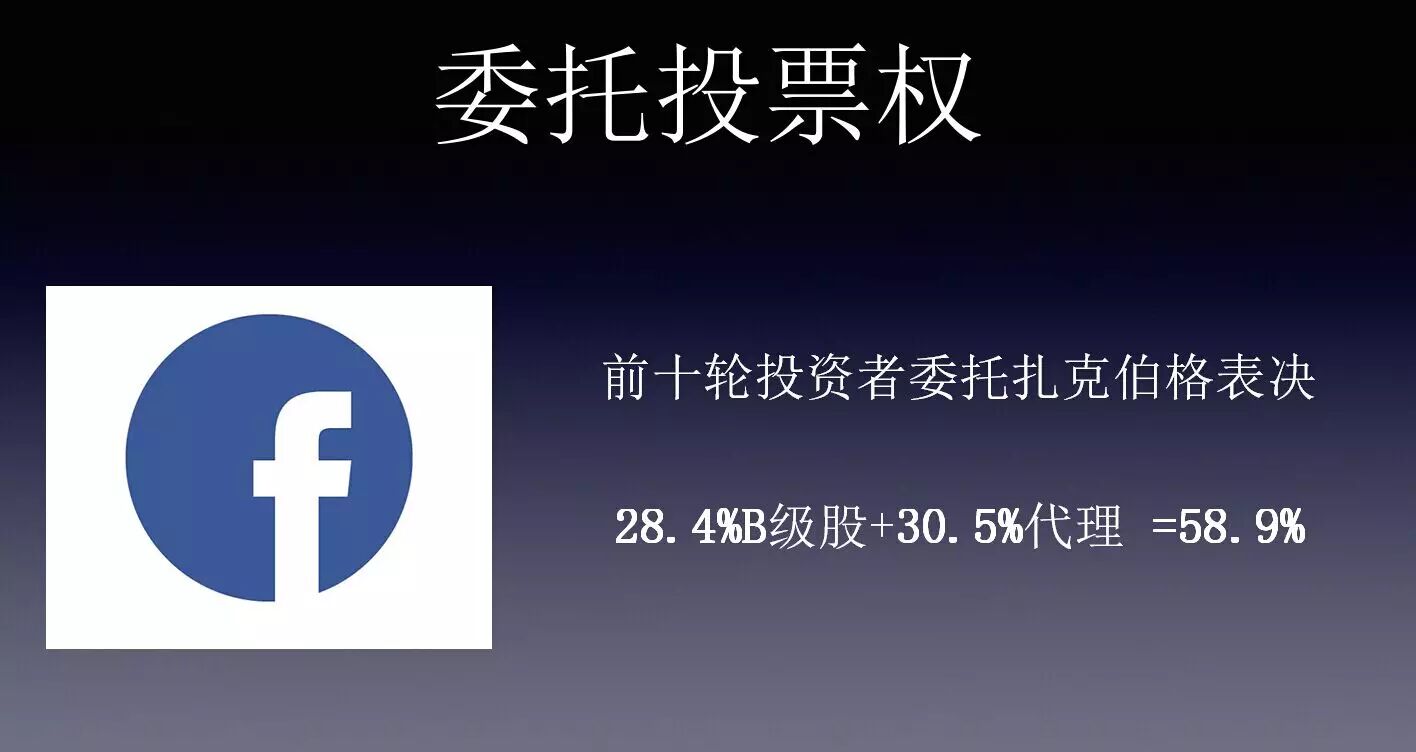 例子:-facebook:前十轮投资者委托扎克伯格表决 28.4%b级股+30.5%代理=58.9%