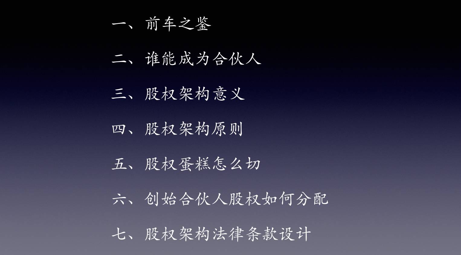 今天的主题是“股权架构都有哪些坑”,我们要分享以下七个方面: