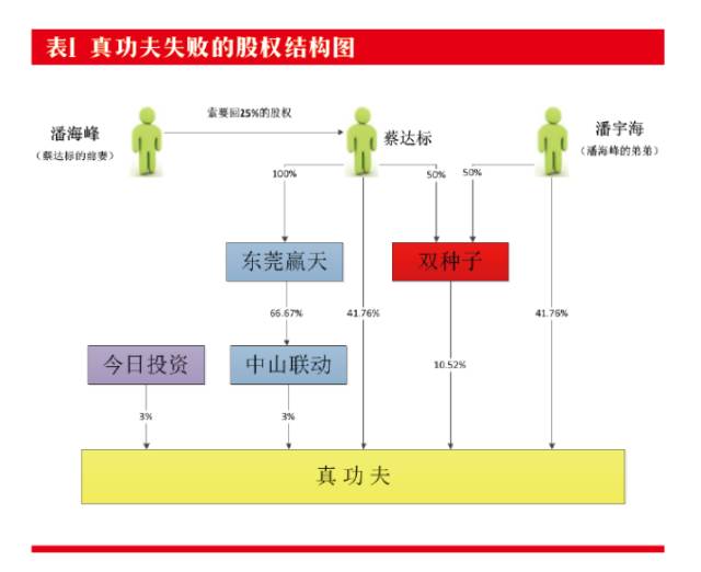 想必“真功夫”的案列,我们很多企业家都有所耳闻。我们分析这家企业的股权结构(见表1)。蔡氏家族和潘氏家族在今日投资与中山联动介入之前,各占50%的股权。当然,两个家族的代表,分别为蔡达标与潘宇海,他们也是通过自然人直接持股与通过“双种子”公司两种方式持有“真功夫”的股份。这个案例的故事情节我想大家之前已经从各种渠道有所了解。潘海峰(化名)原系蔡达标的妻子,后提起离婚后财产纠纷。不仅如此,双方还通过“股权代表诉讼”、“股东知情权诉讼”、“刑事责任诉讼”等,一系列诉讼争夺“真功夫”这家企业的控制权。这一系列股权“争夺战”能持久的根源之一,公司“股权结构”“五五”开、导致任何一方通过“股权争夺战”实现“控股地位”成为可能。另一方面,今日投资、中山联动在投资入股时,对于“平分”均等的股权结构的法律风险以及“姻亲”股东之间的家事风险评估可谓不足。这是一个相对“反面”的案例。