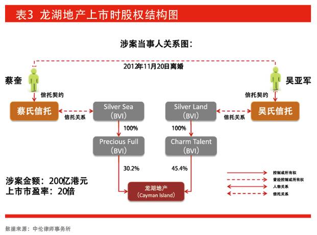 “龙湖地产”(HK.00960)的股权结构(见表3)、特别是其BVI装入家族信托的设计,目前,是私人财富管理课程中最常被提及的案例了。在该案例中,原中国女“首富”吴亚军与蔡奎原为夫妻关系。双方离婚时,公司尚未在香港上市。为避免婚姻变动对公司上市的影响,双方在公司上市之前,搭好离岸公司股权结构并装入吴氏、蔡氏各个独立的信托内,实现了离婚、公司上市的“两不误”。从公司上市后的股价表现来看,招股文件披露的两人离婚信息,并没有引起股民与资本市场机构投资者的担心。我经常在商学院授课时引用这个案例。我认为,龙湖地产案例的意义,不在于境外信托内容设计得如何精妙,而在于“两个该用信托的股东在该用信托的时间用好了信托这个工具”。双方不仅能在离婚过程中协调解决了“人身”关系,而且还分享了资本市场的财产“盛宴”,值得面临婚姻问题的公司股东借鉴与思考。事实上,该海外信托的结构设计,还解决了离婚夫妻的“身后”财富的继承,以及“新”组合家庭成员的利益分配问题,实属高明。